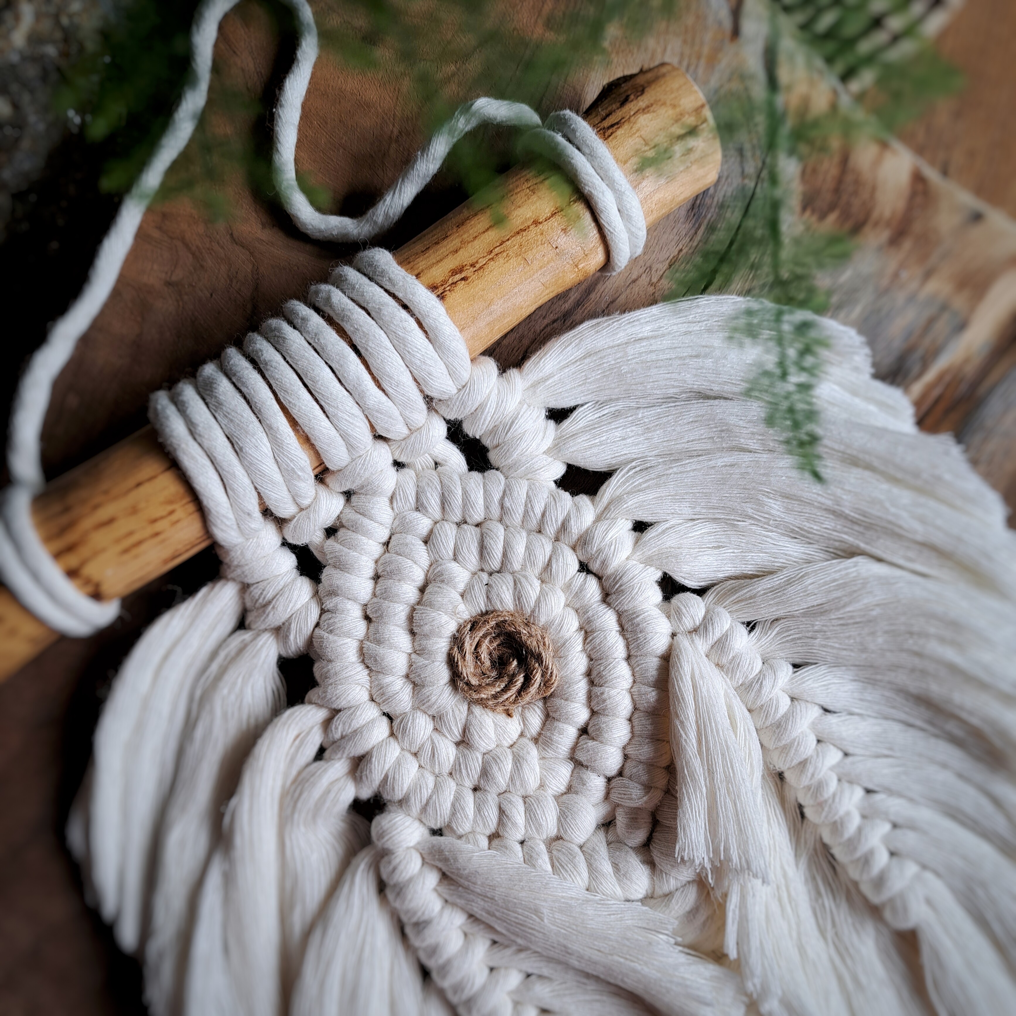 • Materiał: sznurek z organicznej bawełny 9 mm, dwa drewniane pierścienie