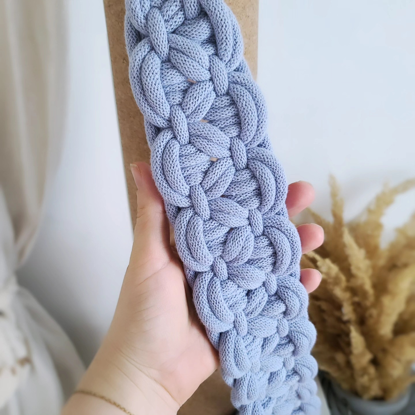 Materiał: sznurek z organicznej bawełny 9 mm, dwa drewniane pierścienie